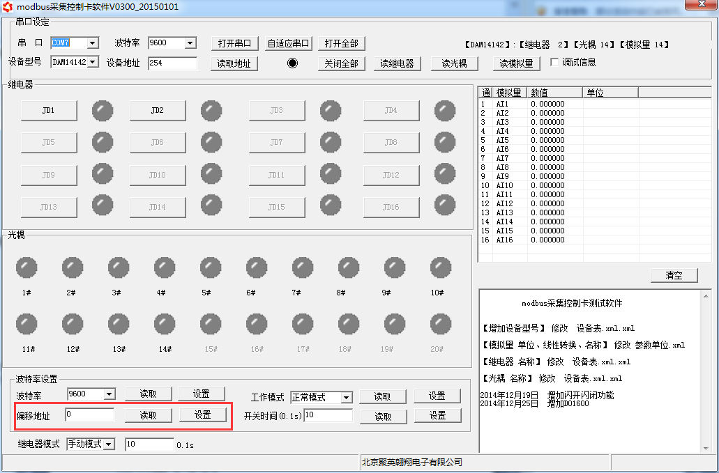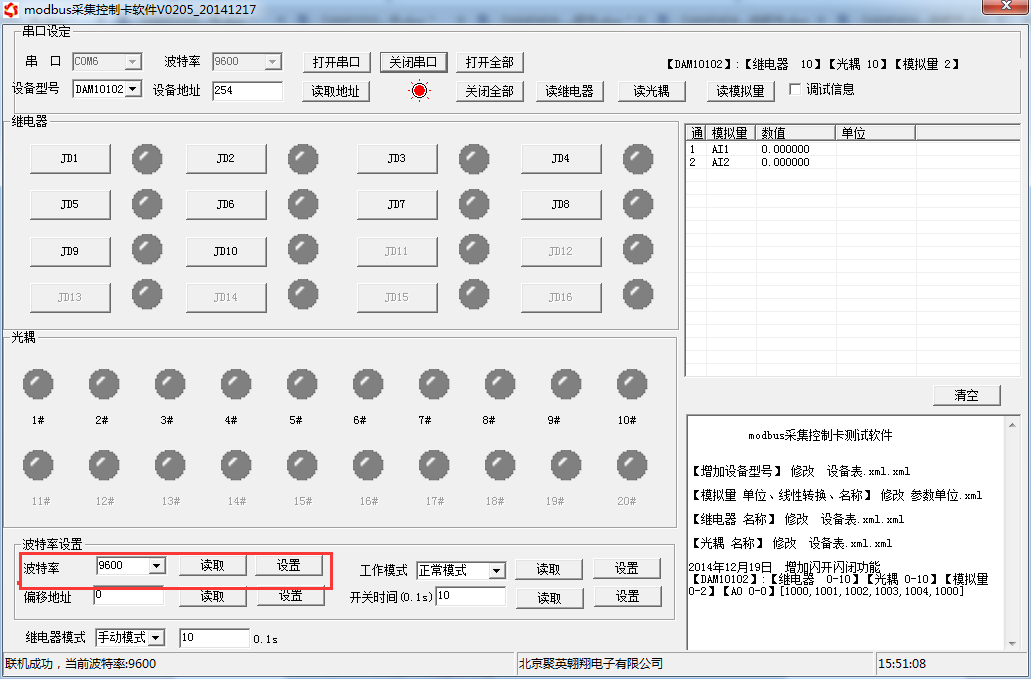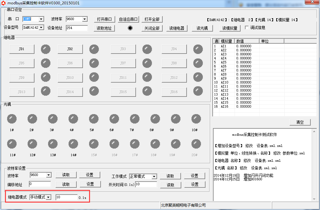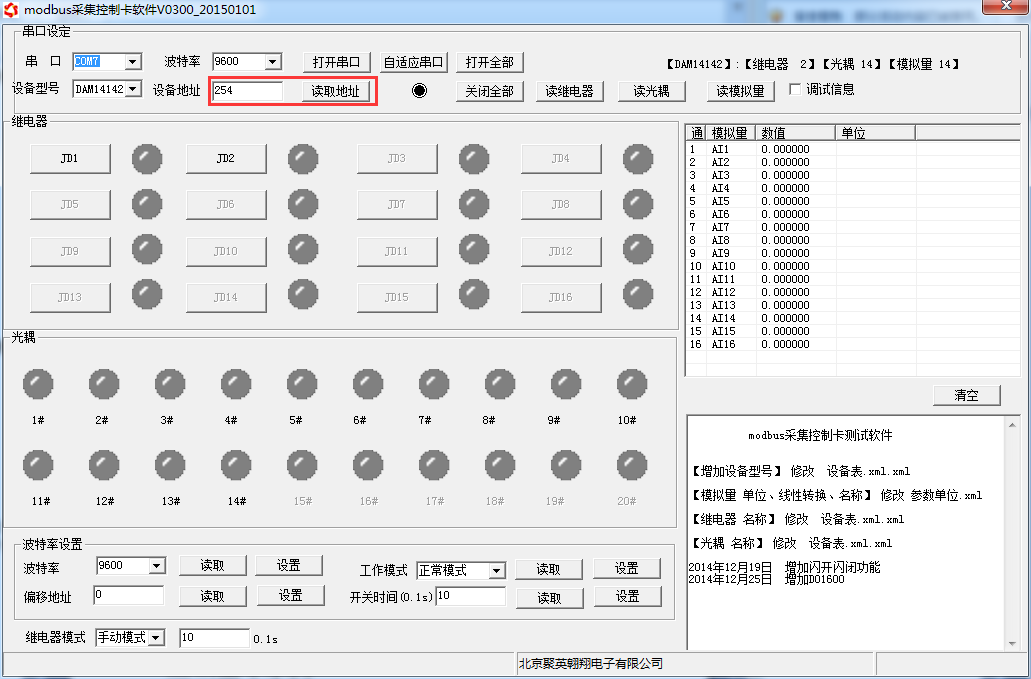 打開“聚英翱翔DAM調(diào)試軟件”;串口設(shè)定欄:串口選擇您電腦對應(yīng)COM口,波特率選擇設(shè)備默認(rèn)波特率(9600)(未自己設(shè)置過波特率前),設(shè)備地址填寫“254”(254為設(shè)備的廣播地址),設(shè)備型號選擇相對應(yīng)型號,設(shè)置好以上設(shè)備的4個(gè)參數(shù)后點(diǎn)擊打開串口,點(diǎn)擊繼電器按鈕“JD1”若繼電器反應(yīng)則連接成功。