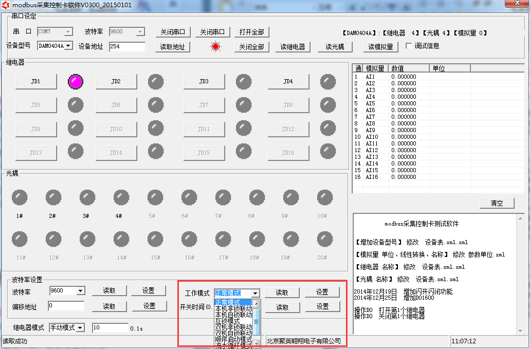 打開“聚英翱翔DAM調(diào)試軟件” 點(diǎn)擊下方工作模式設(shè)置欄的“讀取”和“設(shè)置”就可以分別讀取和設(shè)置工作模式。