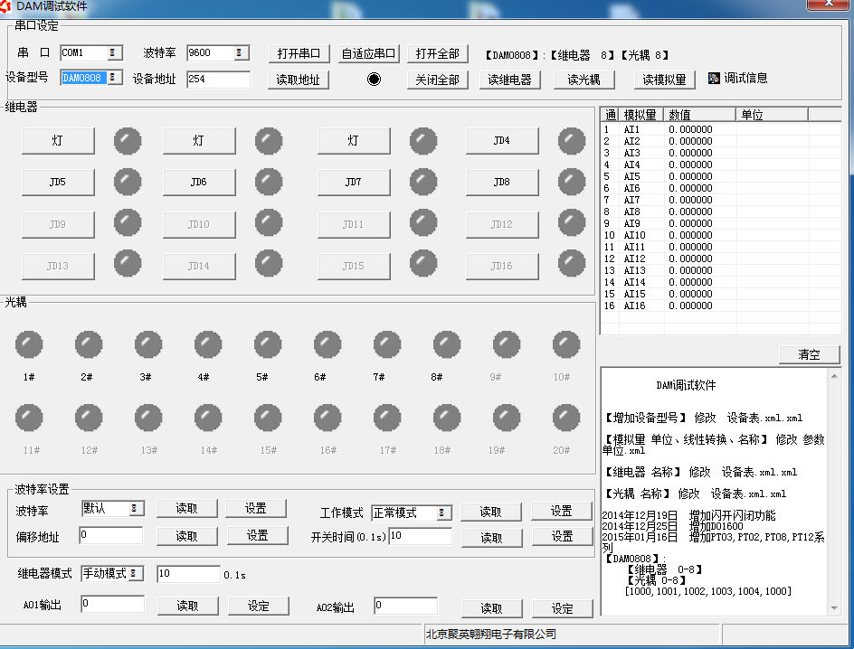 打開“聚英翱翔DAM調(diào)試軟件”;串口設(shè)定欄:串口選擇您電腦對(duì)應(yīng)COM口,波特率選擇設(shè)備默認(rèn)波特率(9600)(未自己設(shè)置過波特率前),設(shè)備地址填寫“254”(254為設(shè)備的廣播地址),設(shè)備型號(hào)選擇相對(duì)應(yīng)型號(hào),設(shè)置好以上設(shè)備的4個(gè)參數(shù)后點(diǎn)擊打開串口,點(diǎn)擊繼電器按鈕“JD1”若繼電器反應(yīng)則連接成功。