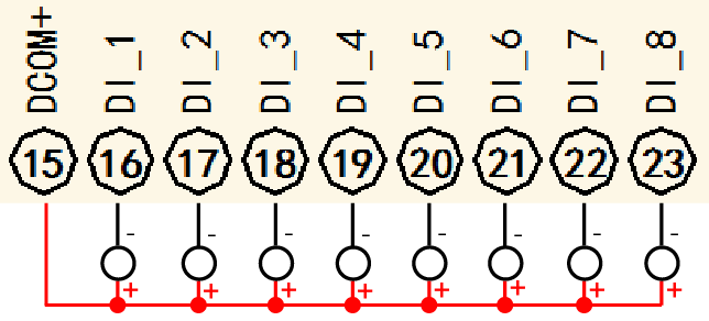 DI(開關量輸入) | 15 | DCOM+ | 開關量輸入信號正(共正,電壓范圍DC5-30V) |
