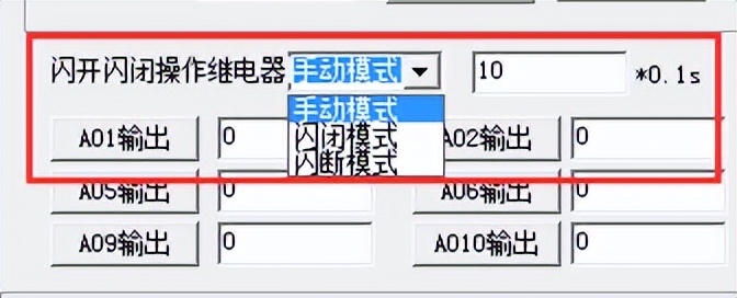 打開“聚英翱翔DAM調試軟件”點擊繼電器模式后面下拉箭頭進行模式的選擇。(后邊時間可自行設置,實際時間=填寫數字*0.1【單位秒】)