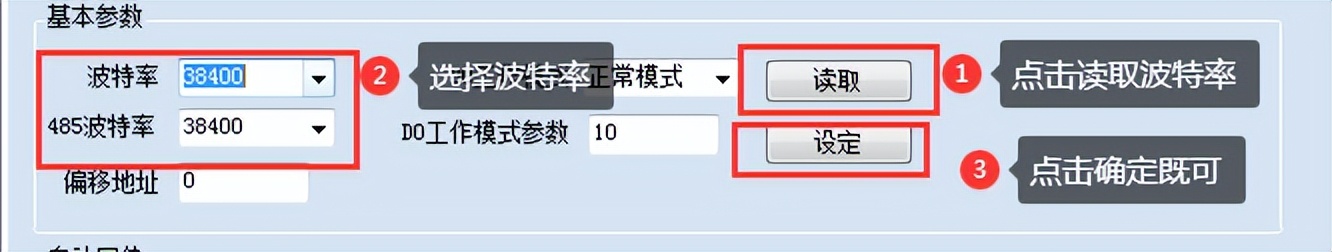 點擊下方波特率設置欄的“讀取”和“設置”就可以分別讀取和設置波特率和地址,操作后需要重啟設備和修改電腦串口設置。