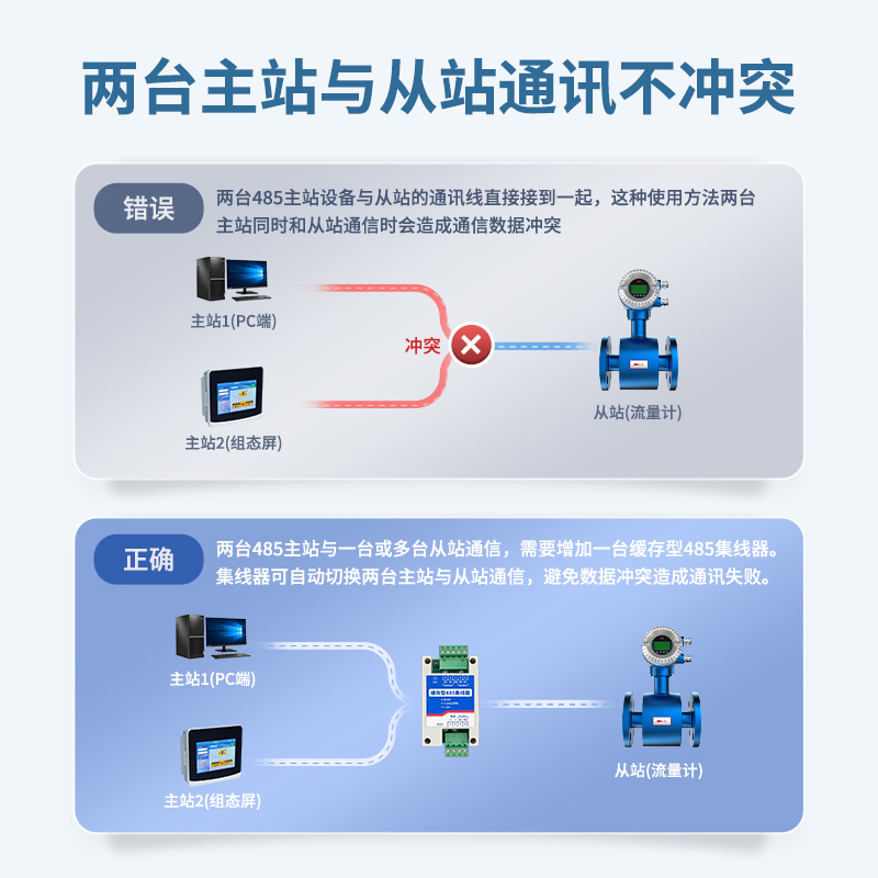 緩存型RS485集線器,兩臺主站與從站通訊不沖突,解決兩臺主機和一臺或多臺從機通信時導致數據沖突,兩臺485主站與一臺或多臺從站通信,需要增加一臺緩存型485集線器。集線器可自動切換兩臺主站與從站通信,避免數據沖突造成通訊失敗。