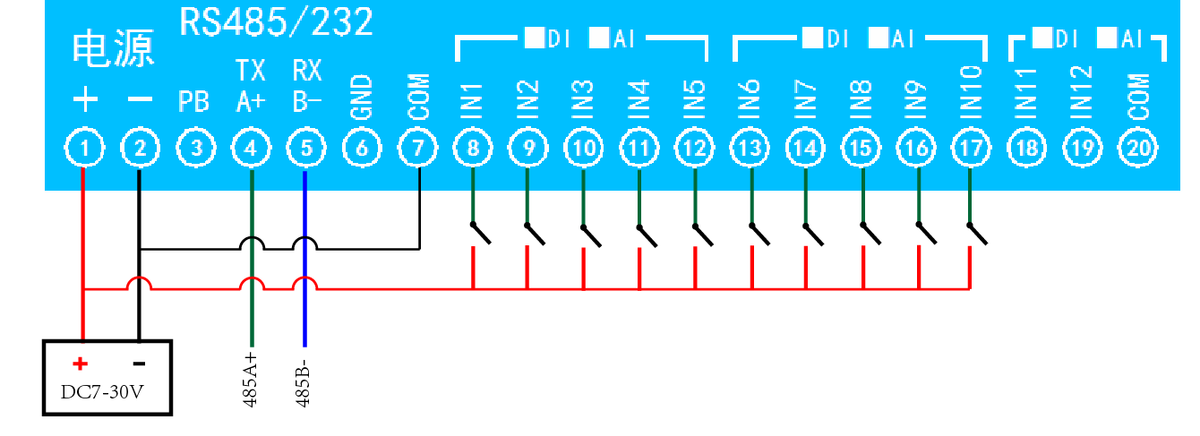 電腦自帶的串口一般是RS232,需要配232-485轉換器(工業環境建議使用有源帶隔離的轉換器),轉換后RS485為A、B兩線,A接板上A端子,B接板上B端子,485屏蔽可以接GND。若設備比較多建議采用雙絞屏蔽線,采用鏈型網絡結構。