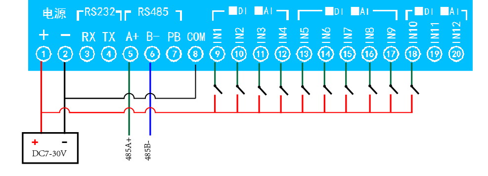 下圖中的ACOM為設備上的供電負極,AINn為設備上的IN輸入