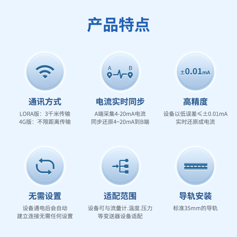 模擬量對傳模塊通過LoRa/4G技術(shù)進(jìn)行通信,信號(hào)傳輸穩(wěn)定可靠,不易受到外部干擾,無需設(shè)置設(shè)備通電后會(huì)自動(dòng)建立連接,電流實(shí)時(shí)同步,設(shè)備可與流量計(jì)、溫度、壓力等變送器設(shè)備適配,設(shè)備精度高,誤差低于0.01mA,支持標(biāo)準(zhǔn)35mm導(dǎo)軌安裝。