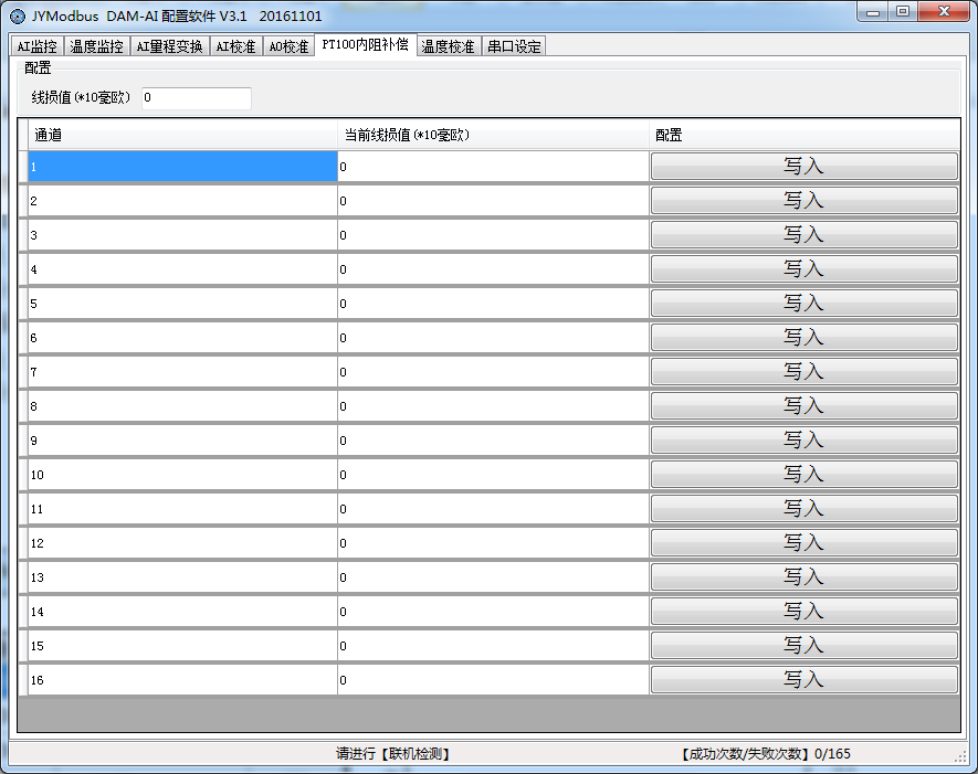 反之實際溫度是20.1度,第一路顯示溫度是20度,說溫度低了0.1度,對應PT100電阻是38毫歐,在線損值輸入框填入-3.8,點擊第一路后邊的
