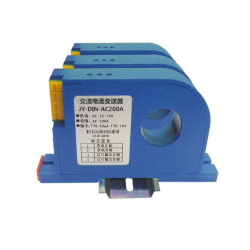 JY-DIN-AC200A/300A交流電流變送器是組合電流互感器、電流變送器于一體的新一代交流電流變送器,它可以直接將被測主回路交流電流轉換成按線性比例輸出的DC4~20mA(通過250Ω 電阻轉換DC 1~5V或通過500Ω電阻 轉換DC2~10V)恒流環標準信號,連續輸送到接收裝置(計算機或顯示儀表)。交流電流變送器單匝穿孔穿芯式結構,使用時無需改動測量主回路,便于現場連接,原副邊高度絕緣隔離,兩線制輸出接線,輔助工作電源+24V與輸出信號線DC4~20mA共用. 交流電流變送器具有精度高,體積小、功耗小、頻響寬、抗干擾功能。電流變送器用于測量電網中波形畸變較嚴重的信號,也可以測量方波,三角波等非正弦波形。